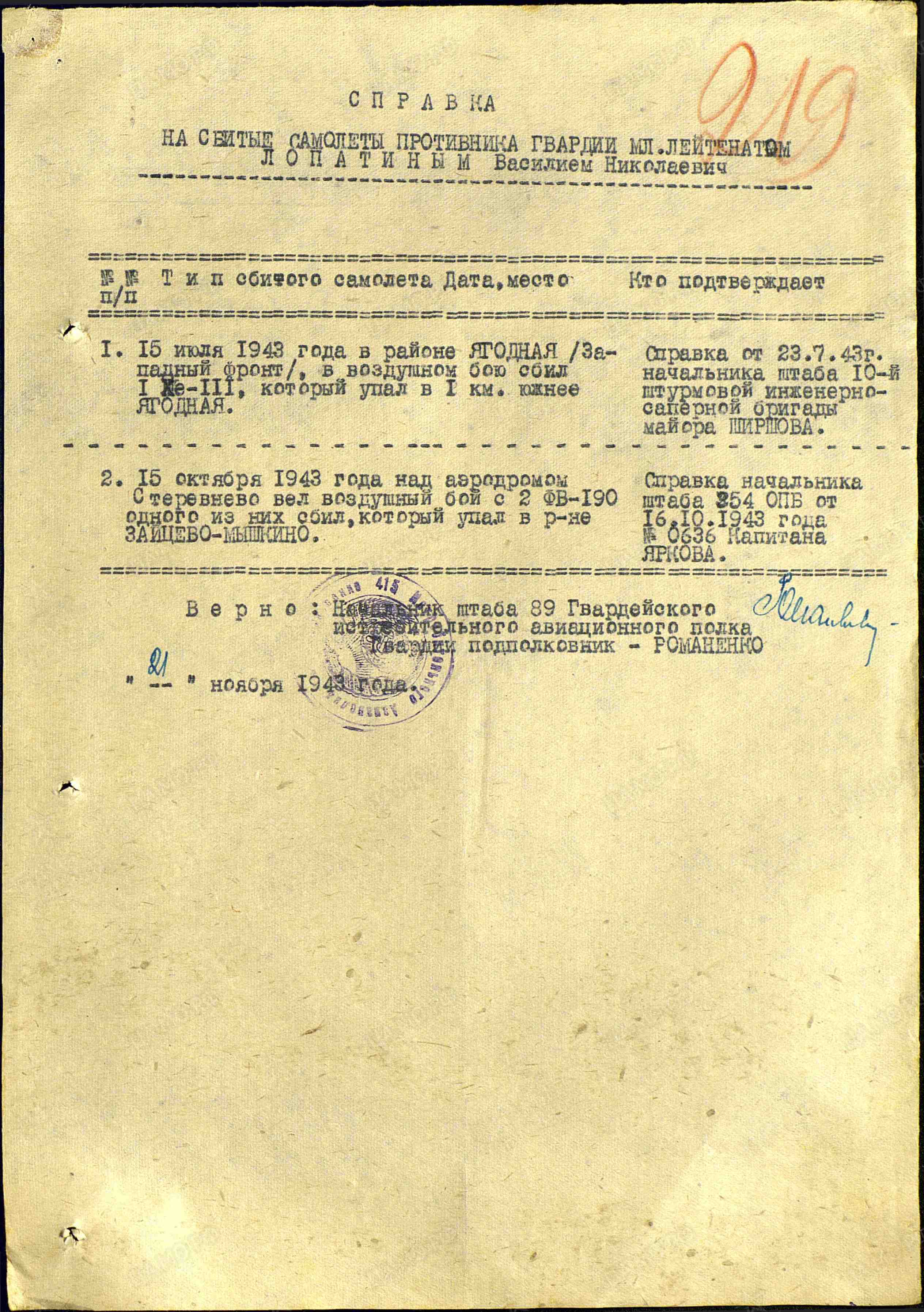 "даже не стрелявший" Лопатин по ЖБД полка http://pamyat-naroda.ru/documents/view/?id=451002226 (18 стр.) таки отстрелялся, уже горящим, куда-то в белый свет и подтверждения от пехоты на два ФВ получили, ну, и к наградному оно приложено:
