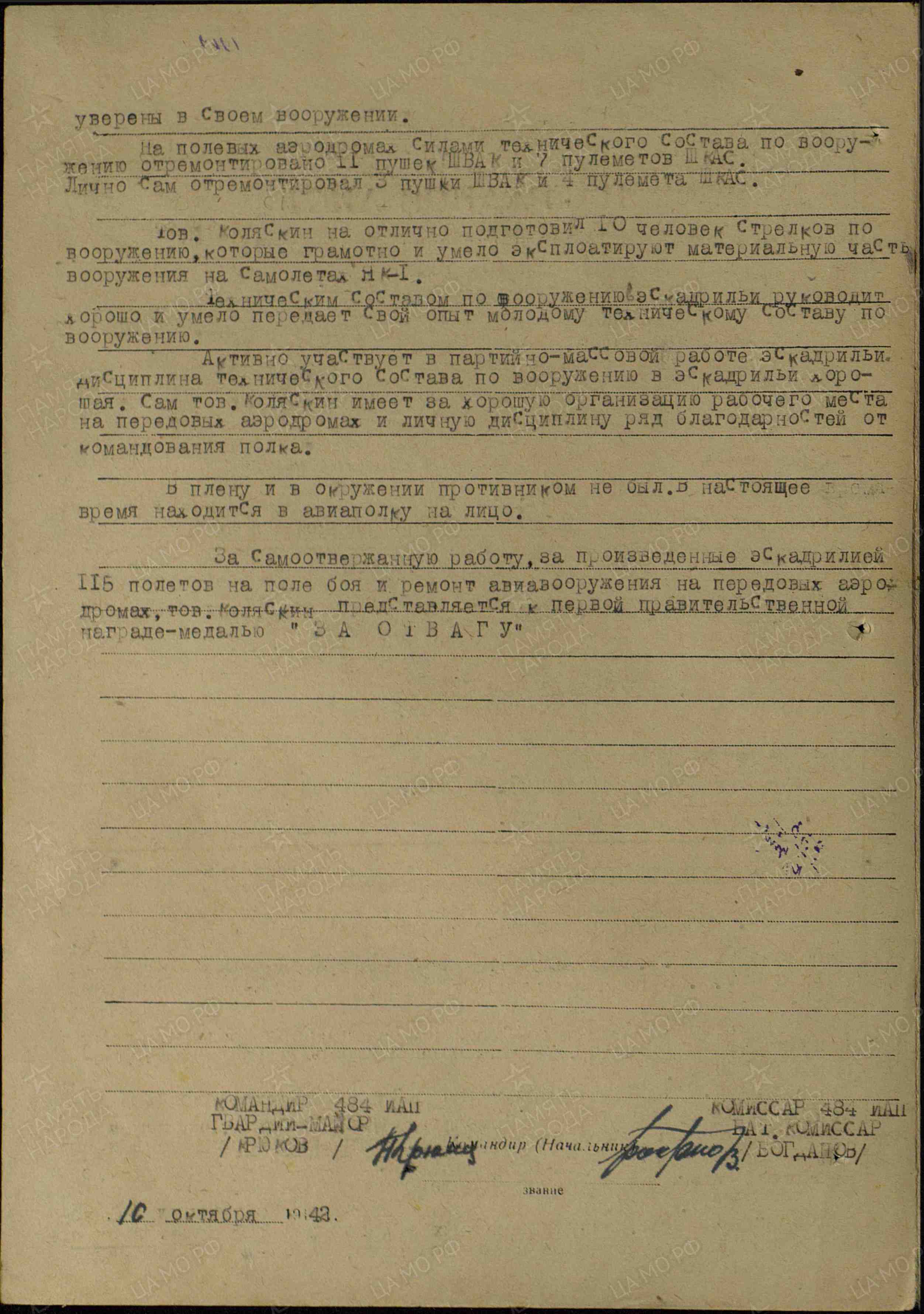 Подписан 10.10.42 комполка гв.майор Крюков(Павел Павлович - подпись совпадает)