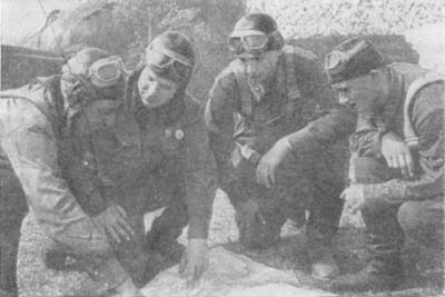 >>"Командир Н-ской эскадрильи старший лейтенант орденоносец А.Д.Булаев принимает рапорт летчиков истребительного звена младших лейтенантов - комсомольцев (слева направо): М.М.Саталкина, Н.Г.Чередкова и Д.П.Лещенко о выполнении ими боевого задания".