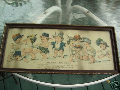 Справа француз дерётся с немцем, топчась на Бельгии, англичанин в шотландской юбочке старается оттащит немца. Слева немец, австриец и турок лупят русского в фуражке, а на помщь ему спешит итальянец. А американец говорит - я долго пытался оставаться нейтральным и жить в мире, но если кайзер думает что я трус, то он будет неприятно разочарован.