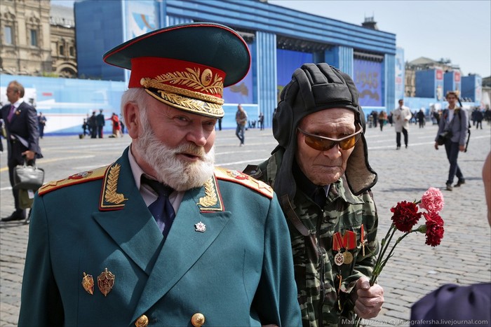 Этот же пенсионер на прошлогоднем параде в честь 70-летия Великой Победы находился на гостевой трибуне в маршальском мундире.