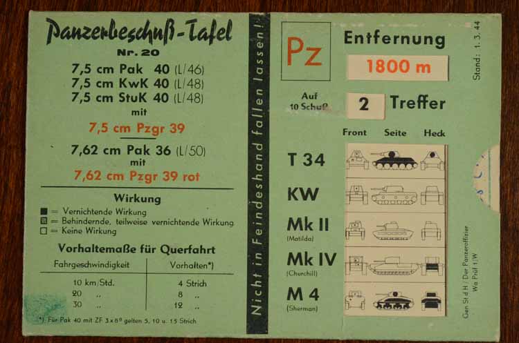 своего рода бумажный баллистический вычислитель/учебное пособие - двигающиеся листы позволяют определить число попаданий на 10 выстрелов по разным танкам, из разных пушек, разными снарядами на разных дальностях. Уязвимые места - черное, где "не пробьет" - белое. Самый неуязвимый танк - КВ, самый уязвимый - "Шерман", данные по Т-34, КВ, "Матильде", "Черчиллю" и "Шерману":