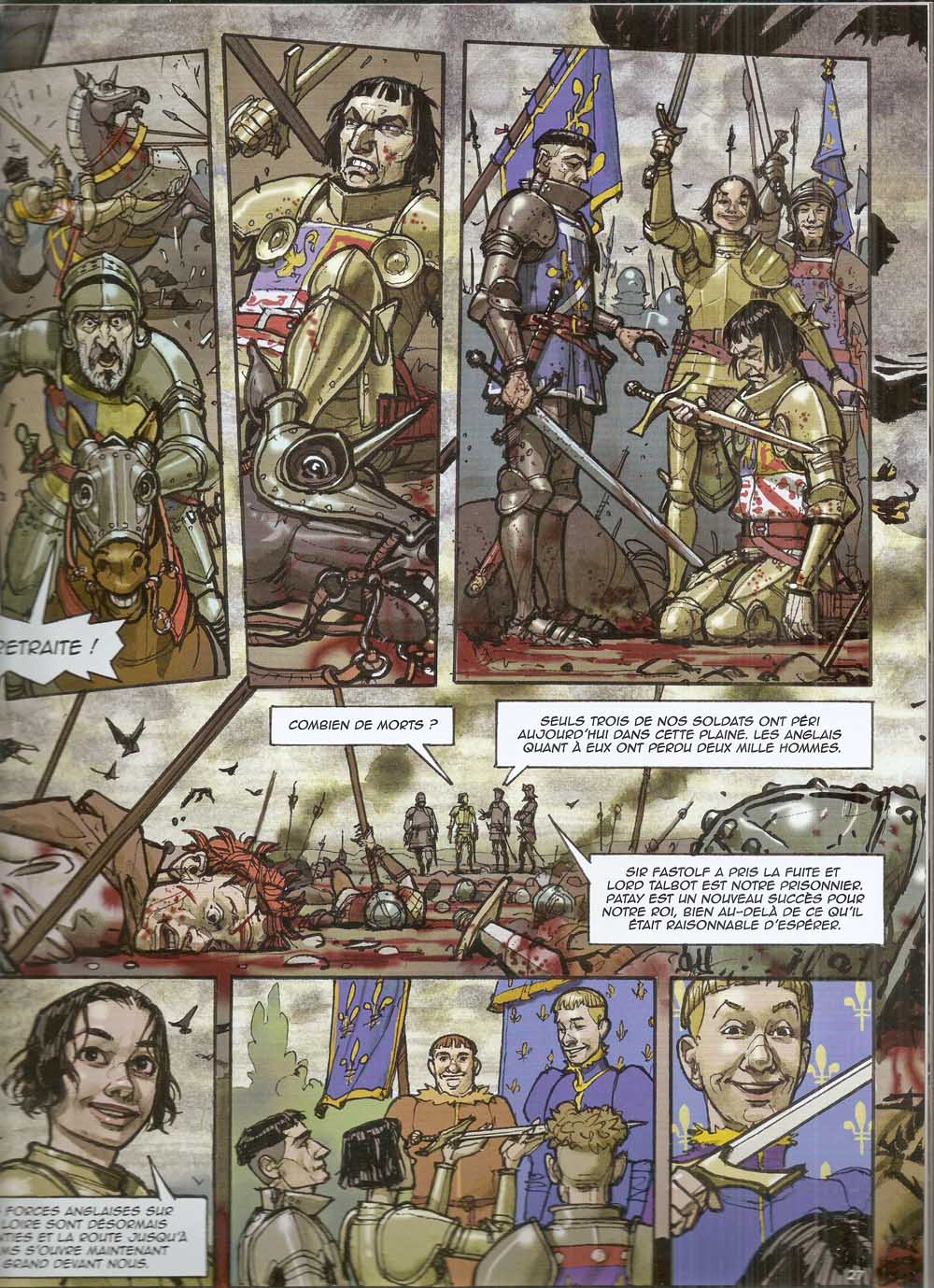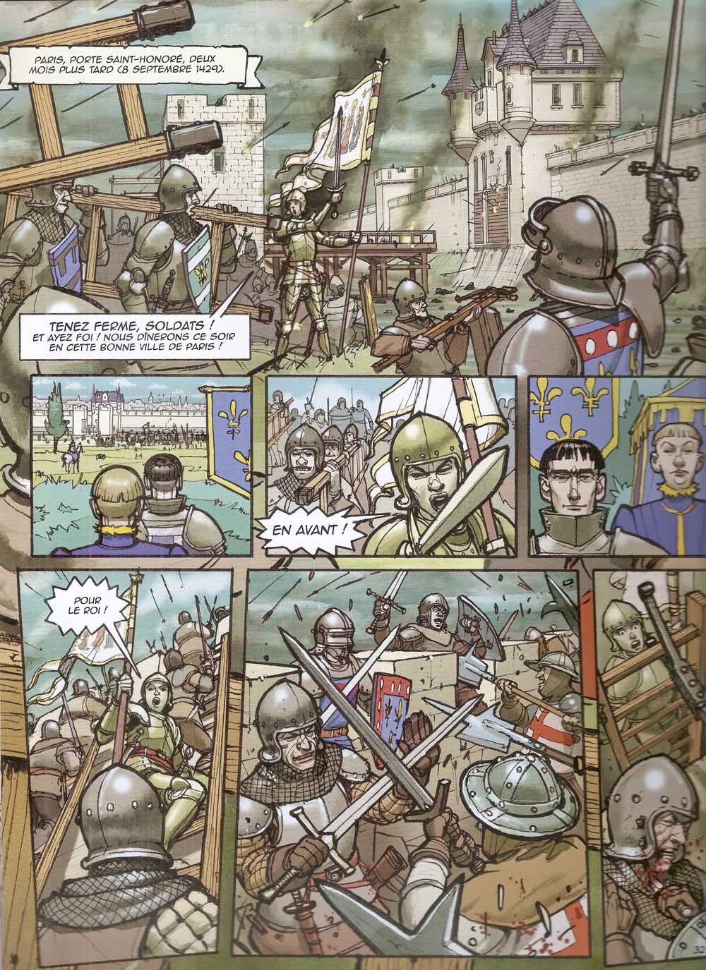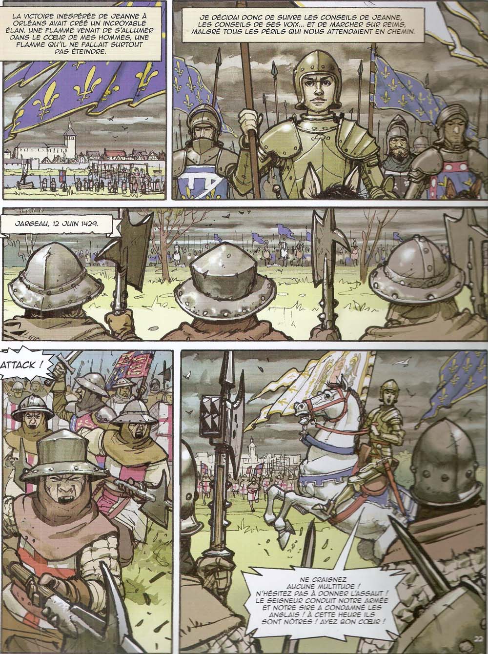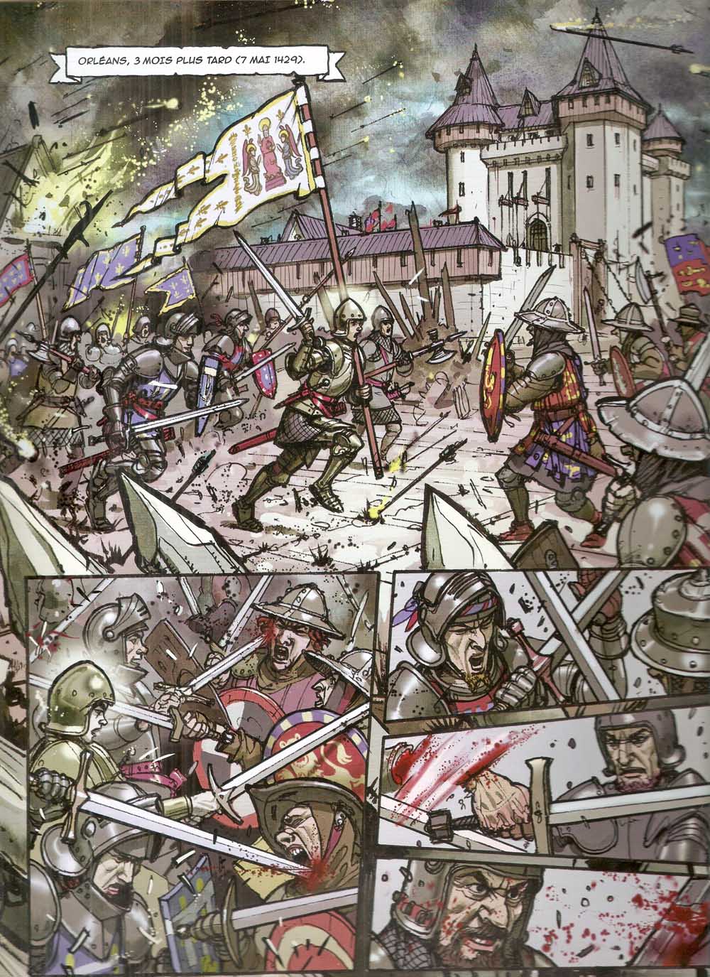 Во Франции в данный момент печатается серия исторических комиксов "Они создавали Историю". Вышли книшки про Людовика Святого, Верцингеторикса, Наполеона, Саладина, Чингис Хана и проч. Первый из перечисленных у меня есть, хотя я и не в восторге от прорисовки, второй -- вполне приличный, пусть и не выдающийся. Остальные -- или странные, или неинтересные, поэтому их аффтараф я полновесным (пока) европейским рублём не поддержал. Но вышедший недавно комикс про "Орланскую деву" переплюнул всех:
