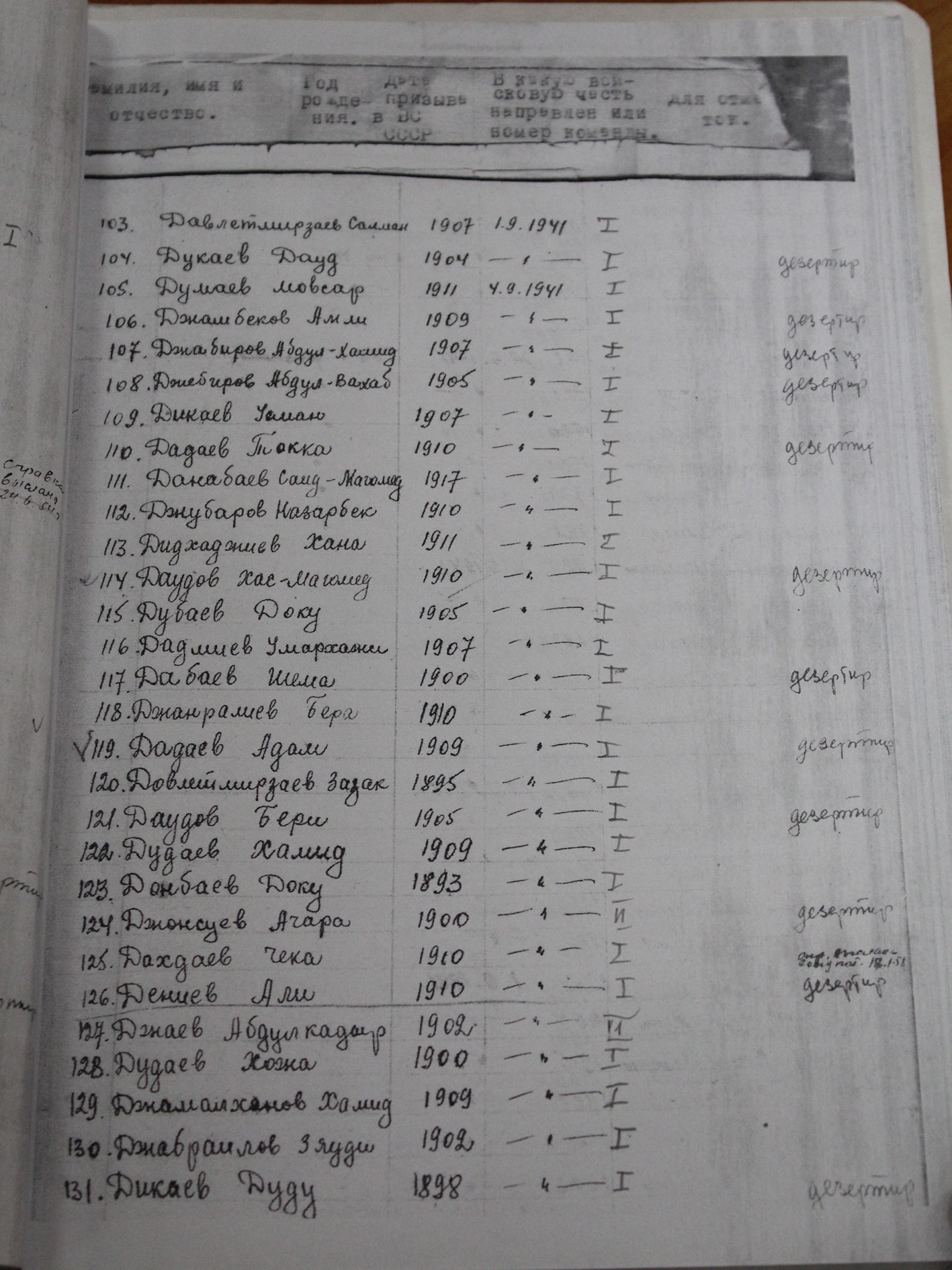 Айдамиров Хаси Бауевич, рождения 1915 года, кандидат в члены ВКП(б) с 1940 года… чеченец, крестьянин, образование низшее. В момент привлечения к партответственности работал председателем колхоза им. Ленина сел. Урус-Мартан, в данное время завхоз того же колхоза. 7 марта 1942 года Урус-Мартановским райкомом ВКП(б) исключён из кандидатов в члены ВКП(б) за невыполнение мобилизационных нарядов, за укрывательство дезертиров и уклонение от службы в РККА … Постановили: решение Урус-Мартановского РК ВКП(б) от 7 марта 1942 года утвердить, Айдамирова Х.В. за уклонение от службы в РККА из кандидатов в члены исключить. (РГАСПИ. Ф.17. Оп.44. Д.284. Л.55–55об.)»