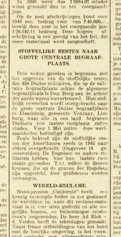 Три недели назад началось перезахоронение 450 немецких солдат, преданных земле на военном кладбище за городским кладбищем в Ден-Бурге. Их останки будут перенесены на большое центральное немецкое кладбище в Эйсселстейне*, община Венрай, Лимбург, где найдут свое последнее пристанище все немцы, похороненные в нашей стране. Эти работы будут завершены к 1 мая.
