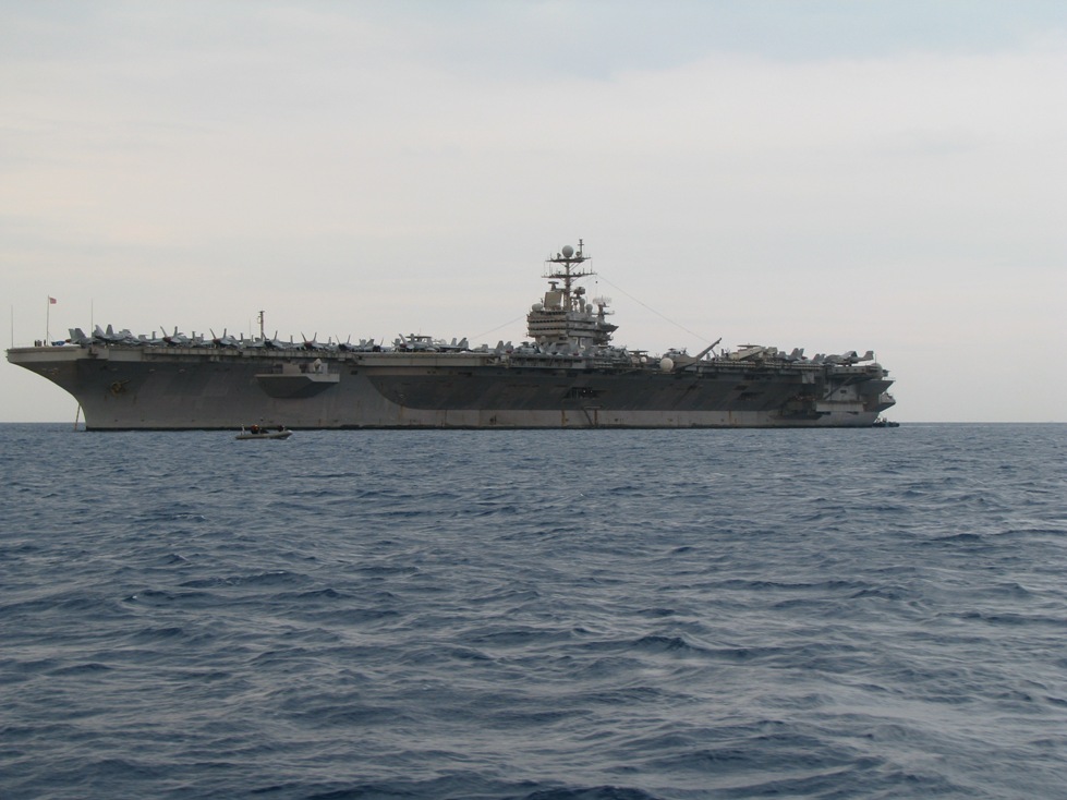 Ну, мы обнаглели и сунулись поближе, пока морпехи на лодке не пошли нас подрезать. Пришлось убираться восвояси :) Зато нафотографировался. Корабль стоял на якоре минимум 2 суток, команда ошивалась по городу. Долго гадали, чего за посудина (специалистов у нас напряг). Только с утра увидели капинаский катер, на котором было написано "Truman".