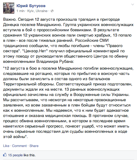 - ха, а ПС Юру Бутусова то подставляет - сообщает что это были его бойцы, из ДУКа (-) - Lazy Cat 13.08.2014 09:58:59 (1018, 0 b)