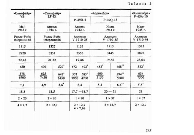 из которого видно, что Кобра имела ТТХ, в лучшем случае приближающиеся к Як-9, и полностью уступала противнику - максимал у земли 468-482, на высоте 594-600 км/ч. Для повышения остроты восприятия в качестве сравнения с нашей стороны предложены Ла-7 и Як-9У, ну практически основные советские истребители ВМВ.