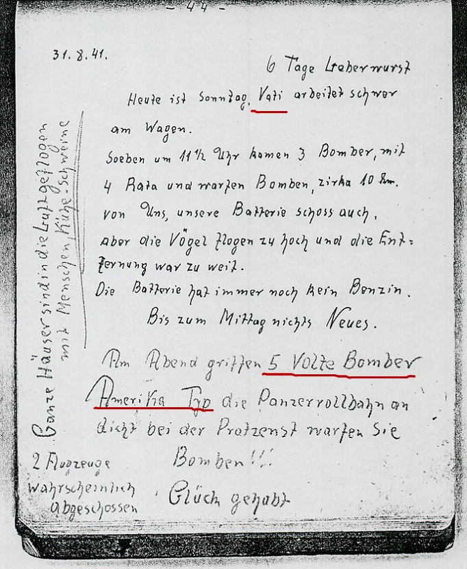 Я тоже у него кое-что нашел но уже в августе. Видать сильно прижали их батарею Су-шки, он пишет, мол, повезло. Но зато смотрите как он их распознает: "Volte Bomber Amerika.." Причем он не рядовой, типа фельдфебель.