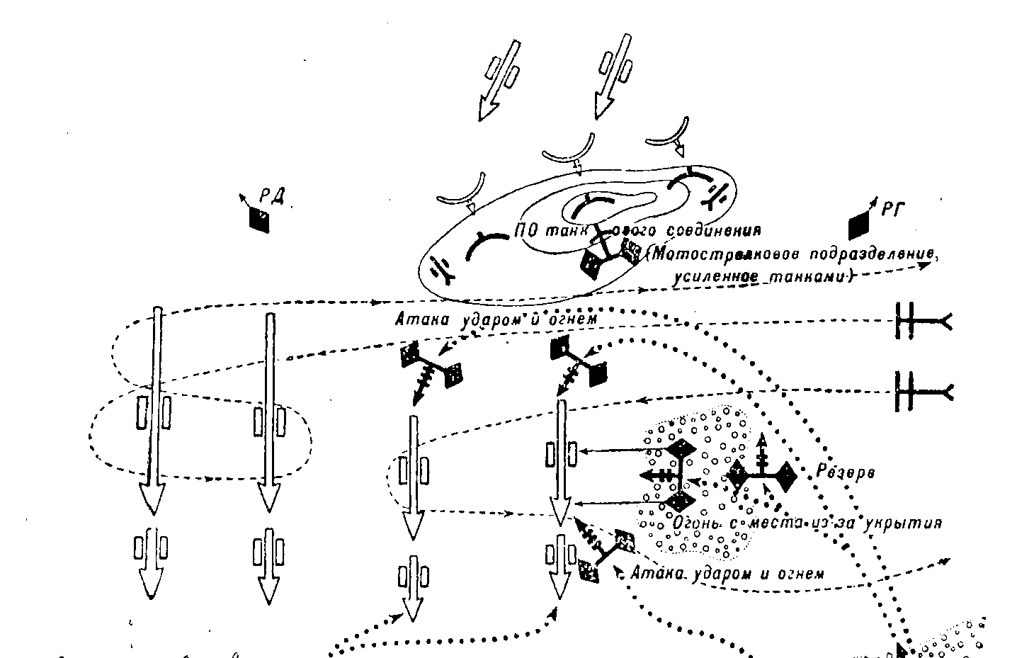 Как видим, на схеме танковая рота из состава сковывающей группы ведет огонь по противнику с места. В составе ударной группы (не менее 2/3 всех танков) действуют три танковых батальона в полном составе (еще одна танковая рота находится в резерве).