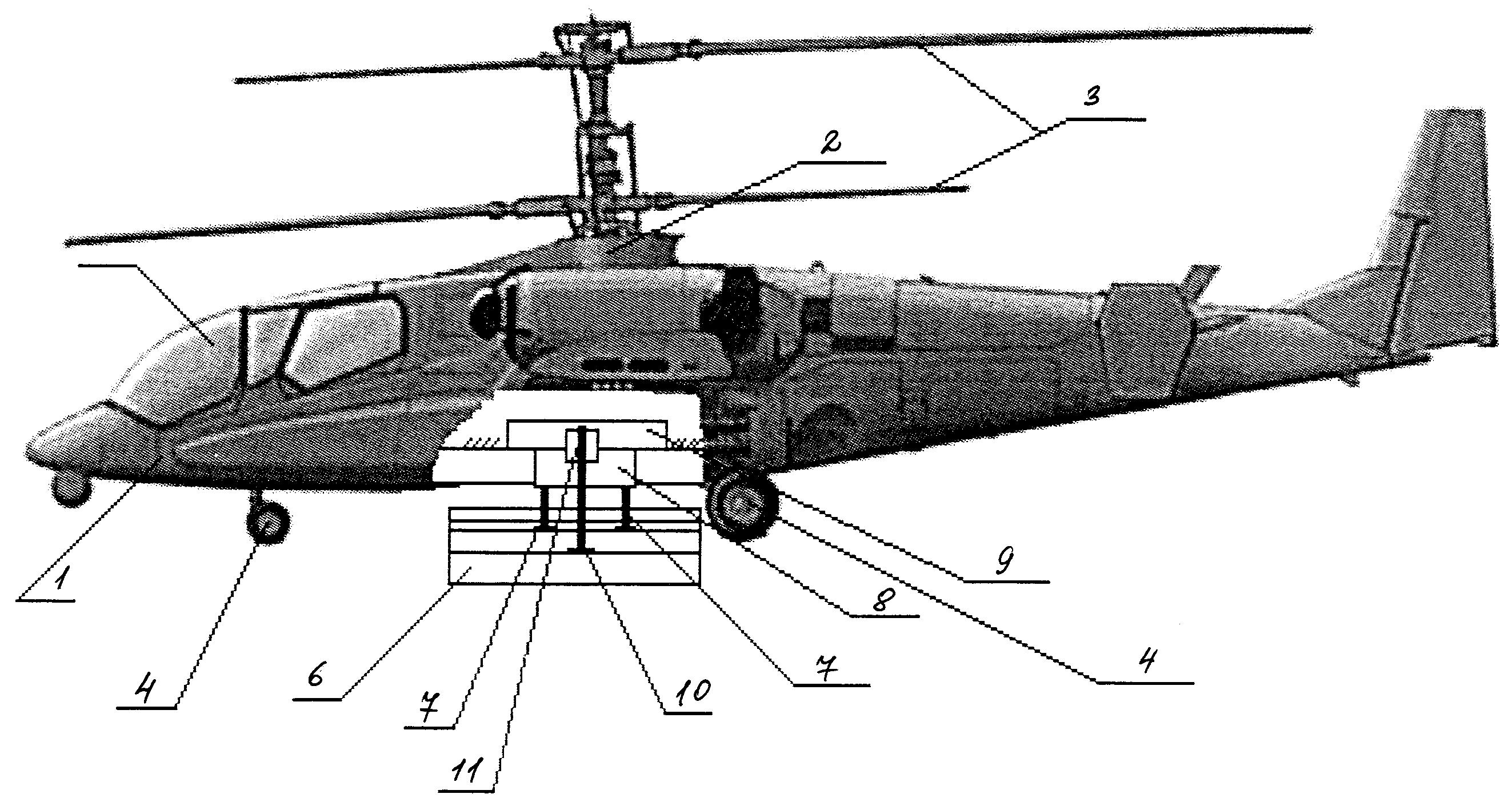 Вертолет, содержащий фюзеляж, силовую установку, соосные винты, шасси, размещенную в передней части фюзеляжа кабину, пилотажно-навигационную систему, систему электроснабжения, систему управления, пульт управления и радиолокационную антенну, отличающийся тем, что антенна установлена под фюзеляжем и имеет возможность вращения относительно вертикальной оси в рабочем положении и поворота относительно горизонтальной оси для перевода ее в рабочее или транспортное положение, причем вертолет снабжен блоком преобразования угловой информации, системой обеспечения тепловых режимов радиотехнического комплекса, а также системой вращения и развертывания антенны, причем антенна имеет возможность связи с приемной и передающей системами для обеспечения соответственно передачи зондирующих сигналов и приема отраженных эхосигналов, системой обработки информации от приемной системы и блока преобразования угловой информации, а также систему контроля работоспособности аппаратуры комплекса и хронизатор.