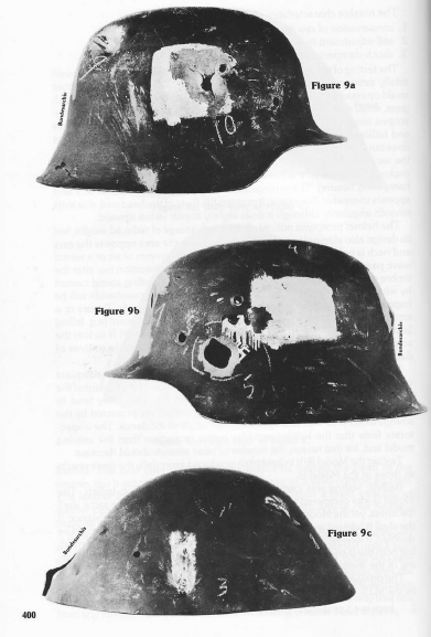 Новый шлем лучше защищал от пуль, вот результаты стрельбы по нему и М35 9-мм пистолетными оболочечными пулями: