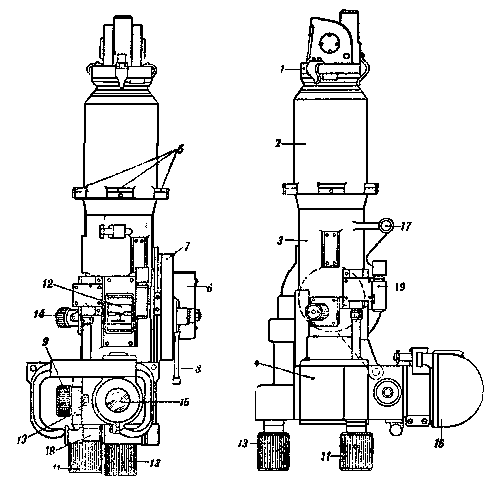 14 — стопор; 15 — окуляр; 16 — налобник; 17 — опорная площадка для регулировочных болтов; 18 и 19 — электрические лампочки.