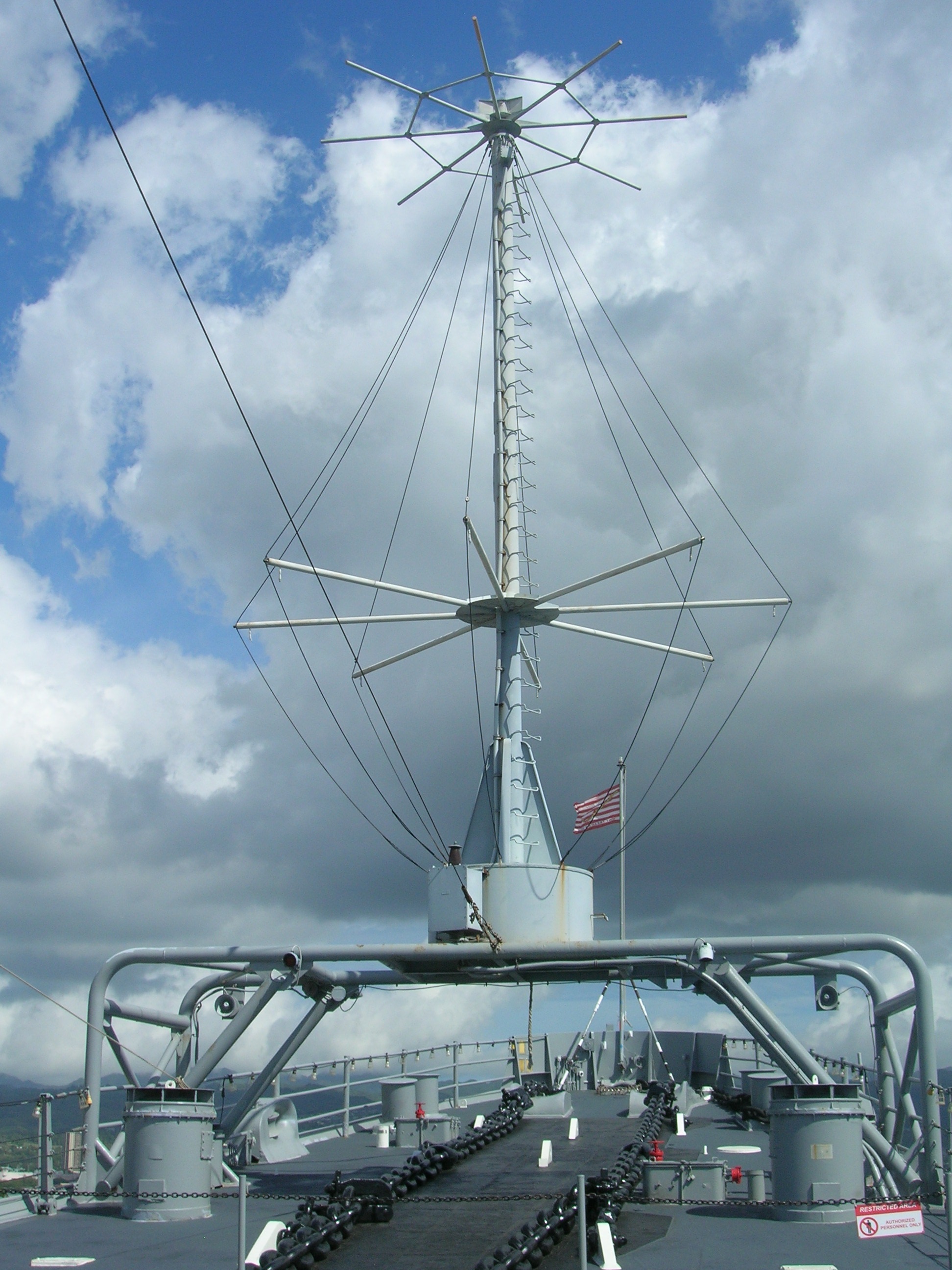 Это специализированная антенная система Link-11 для коротких волн, "придавливающая" земную волну к воде, за счет чего дальность связи этой NTDS легко уходит за 300+ км обычной земной волны и, главное, можно легко коннектиться к БИУС "лосей", несущих такие же противокорабельные "топоры", в целях организации совместной стрельбы.