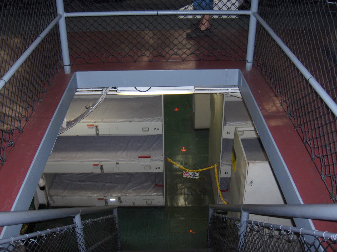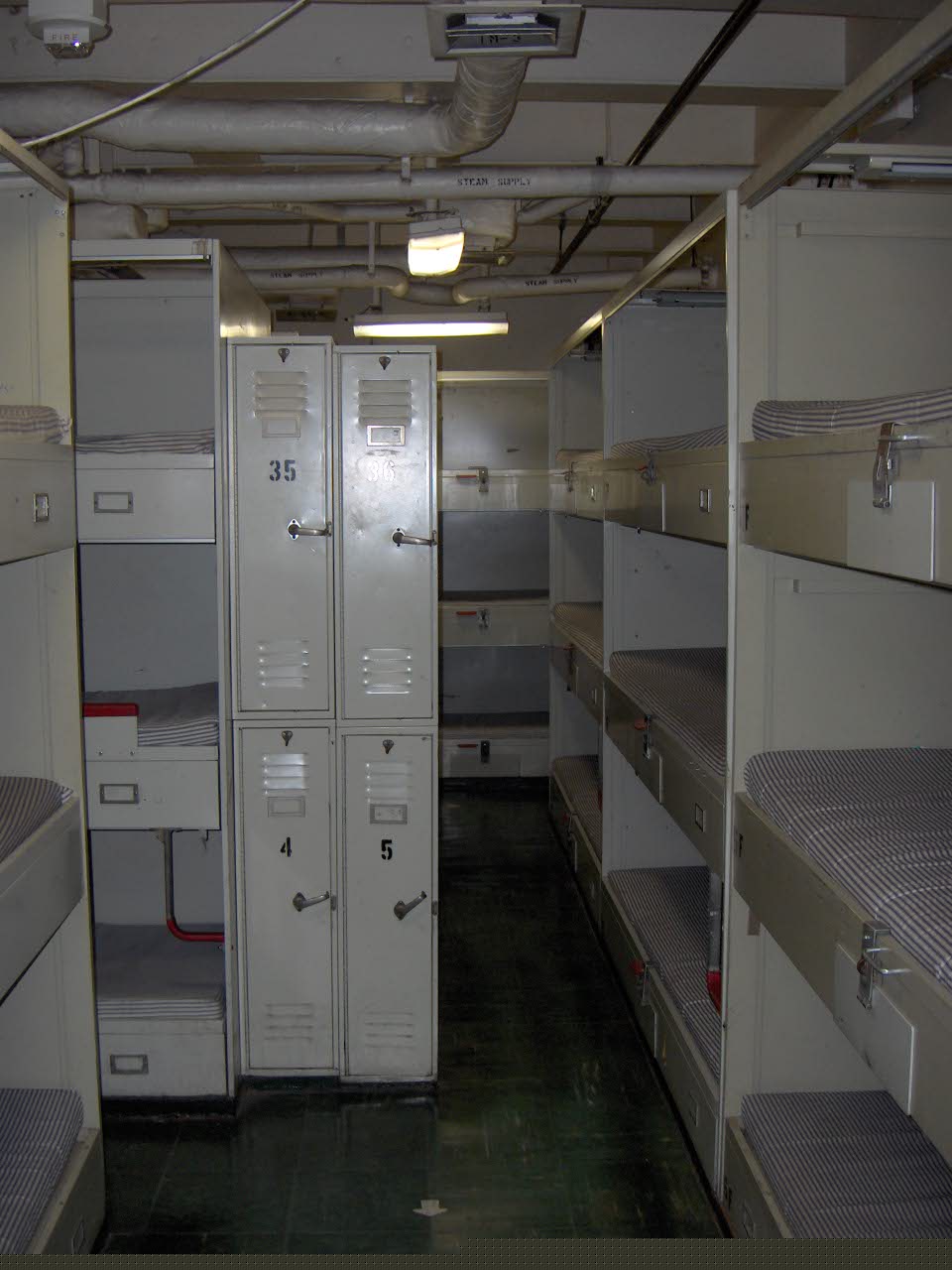 Товарищ служивший на флоте показал, что в таких условиях живут все не офицеры. Младшие лейтенанты и ensign живут в общих кубриках по 25 человек. Койки там уже в два яруса. Офицеры постарше в каютах на два человека. У капитана и старпома персональные каюты. Он служил на корабле с экипажем в 300 человек.