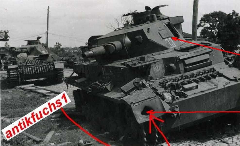 Я так понимаю, их в борт расстреляли. Попадание в крыло явно под углом, снарядом калибра не менее 76 мм. В башне дырка, бортик вокруг люка мехвода поврежден.