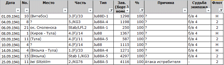 в интересующем нас районе за сентябрь полностью (100%) потеряно девять Ю-88, подчиненных 2 Воздушному флоту, а также частям Хеер. Кроме того, три Ю-88 потеряно на аэродроме Шаталово от бомбардировки, один разбился на нем же, два потеряны слишком далеко - в районе Орла и Курска - их мы можем отбросить.