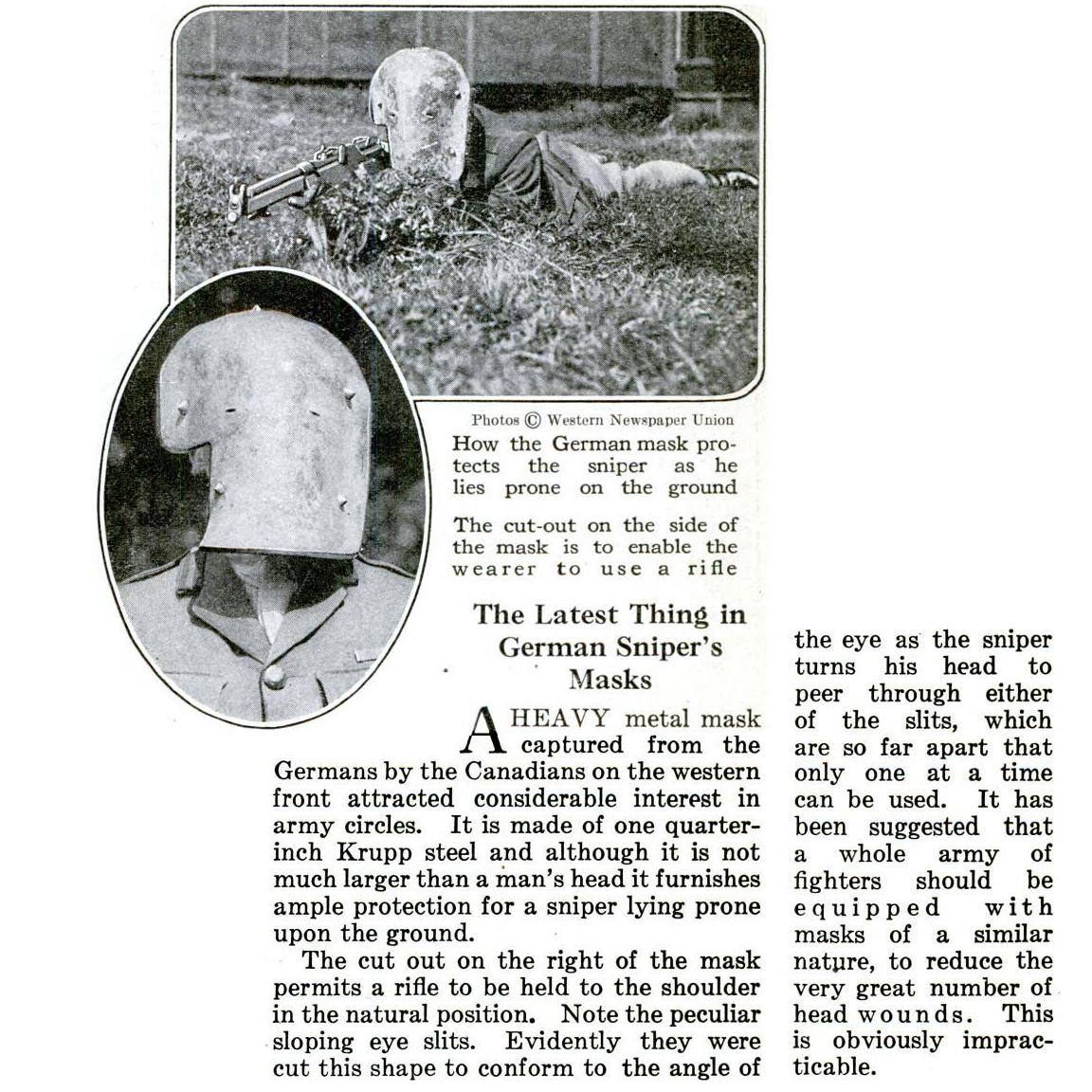 Он состоит из одной четверти дюйма стали Круппа и хотя это не намного больше, чем голова человека он дает достаточную защиту для снайпера лежа на земле. Вырезанные на право маска позволяет винтовку, которая состоится в плечо в естественном положении. Обратите внимание на своеобразный наклонный прорезями глаз. Очевидно, они были вырезаны эту форму, чтобы соответствовать углу глаза, как снайпер поворачивает голову, чтобы заглянуть через одну из щелей, которые так далеки друг от друга, что только один момент времени может быть использован. Было высказано предположение, что целая армия бойцов должны быть оснащены масками аналогичного характера, чтобы уменьшить очень. Большое количество ранения в голову. Очевидно, что это невыполнимо.